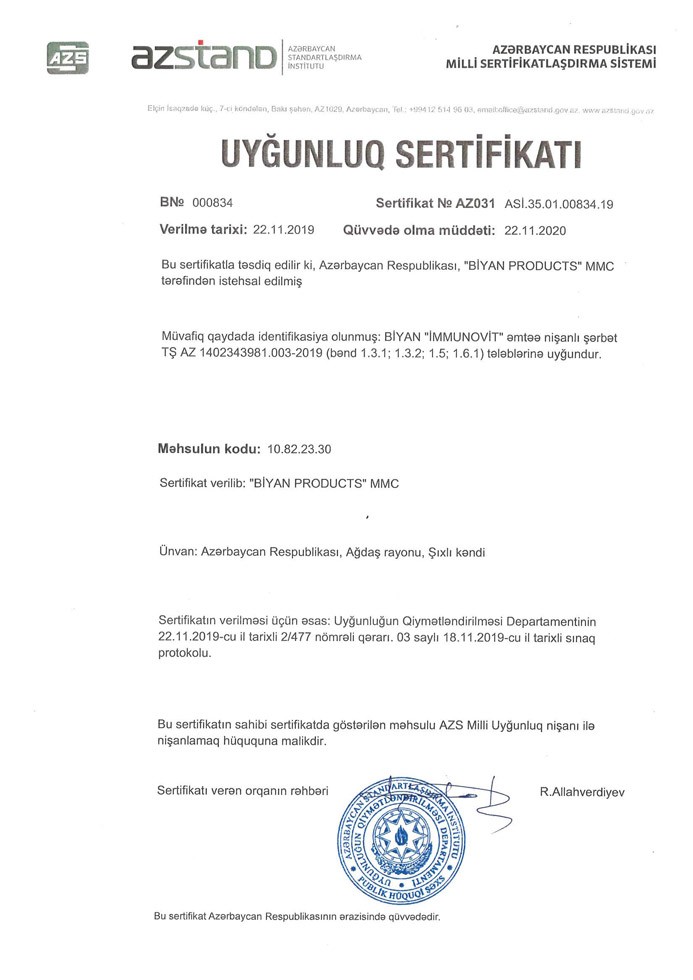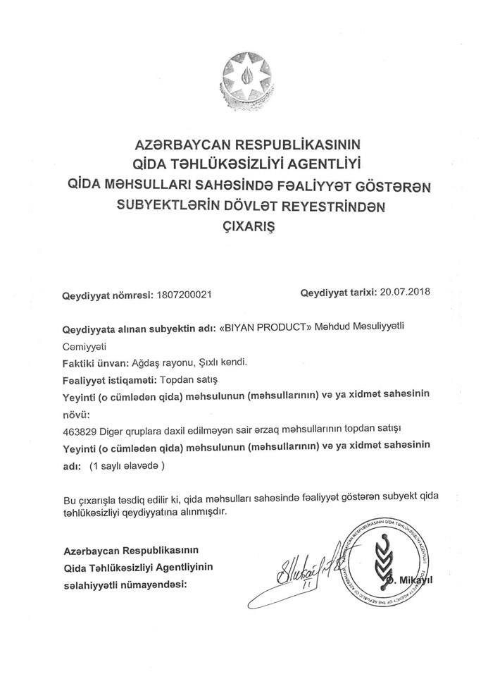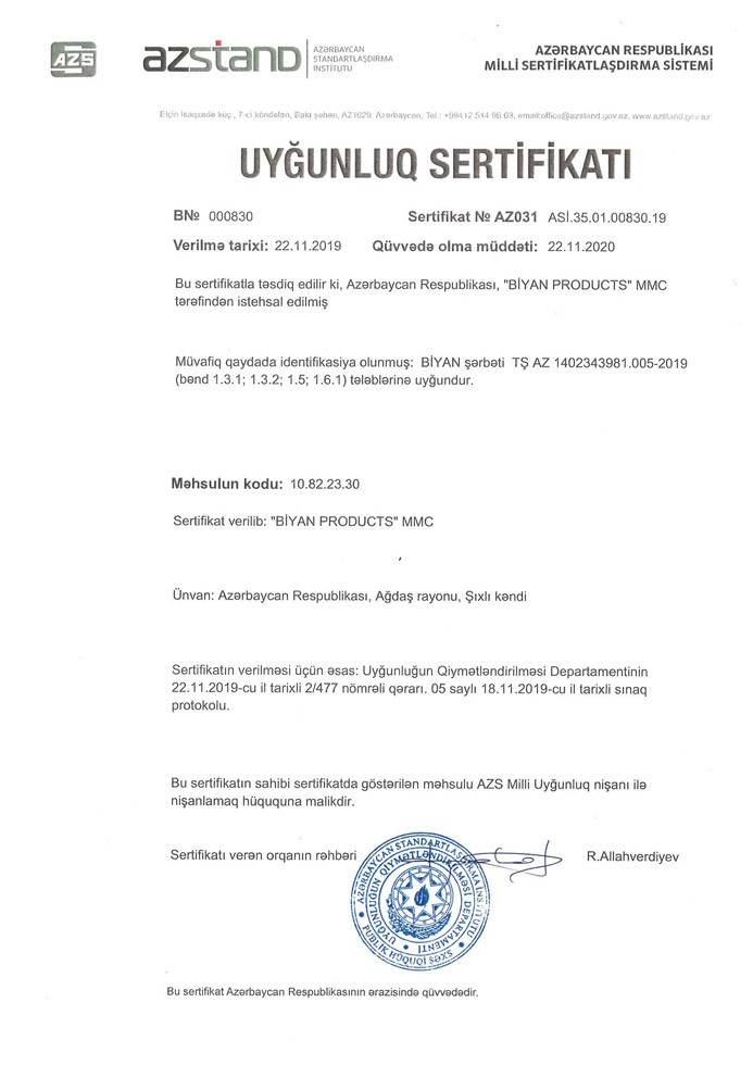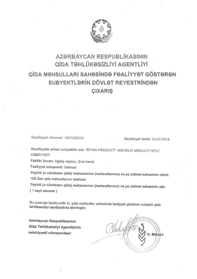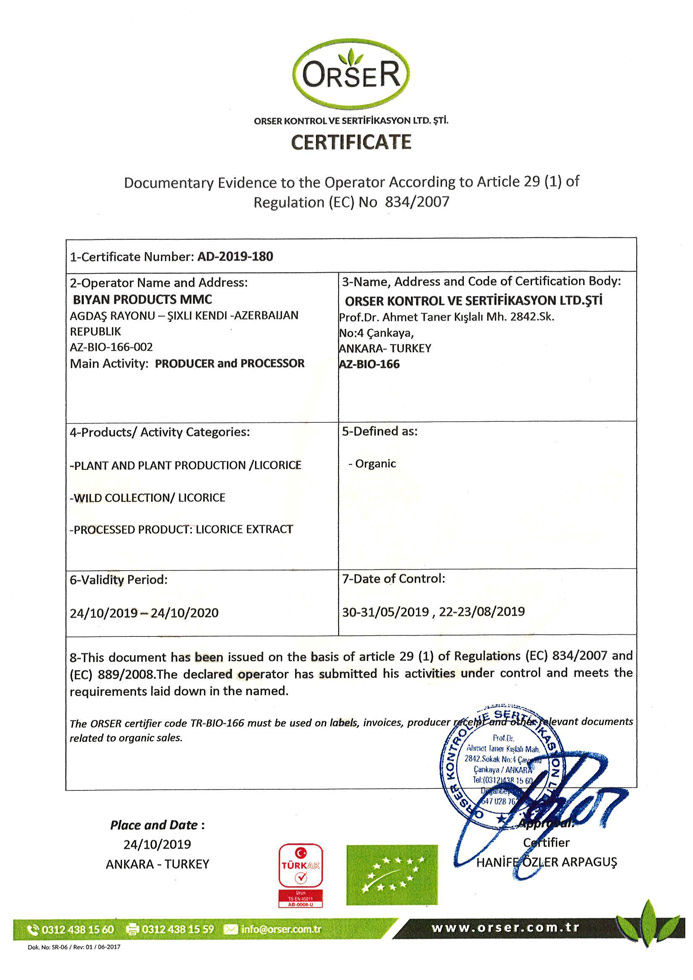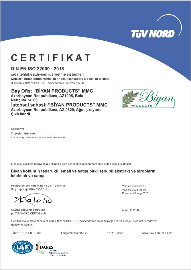 2012-ci ildən fəaliyyət göstərən "Biyan Products" MMC tərəfindən biyan kökündən beş ad altında 100% bitki tərkibli, bioloji fəallığa malik qida əlavələri- siroplar hazırlanır: Biyan şərbəti, Biyan İmmunovit, Biyan Sed, Biyan Qripson, Biyan Broncho.