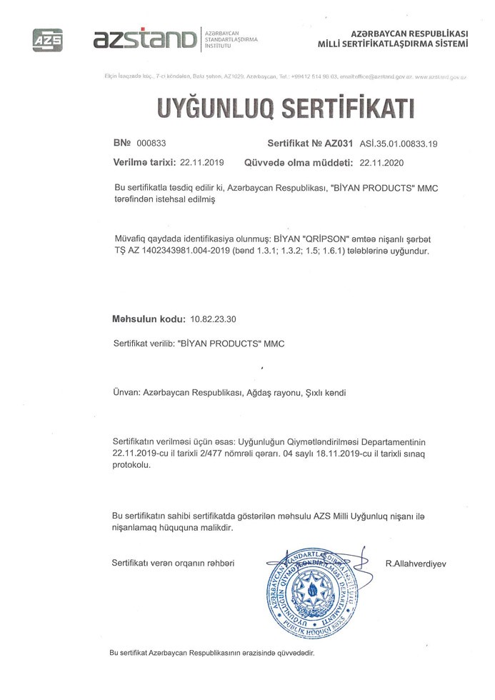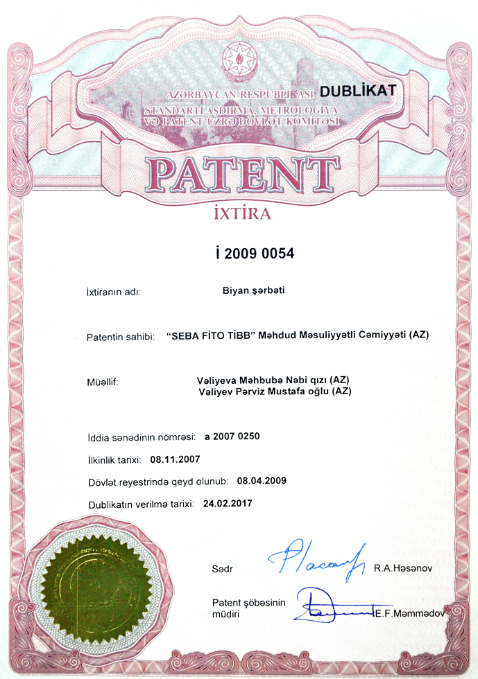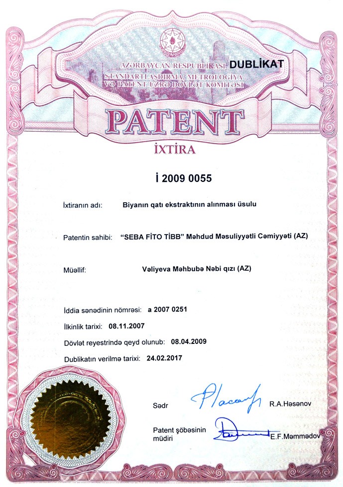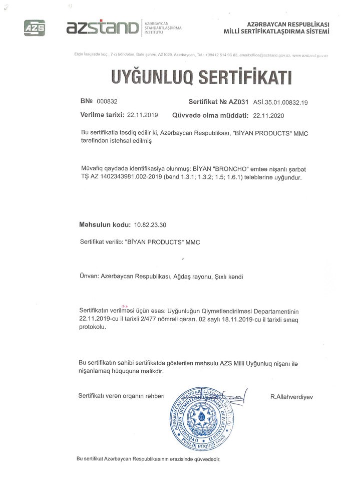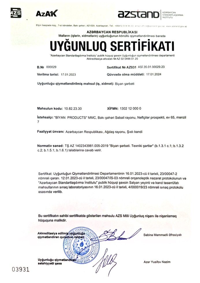 2012-ci ildən fəaliyyət göstərən "Biyan Products" MMC tərəfindən biyan kökündən beş ad altında 100% bitki tərkibli, bioloji fəallığa malik qida əlavələri- siroplar hazırlanır: Biyan şərbəti, Biyan İmmunovit, Biyan Sed, Biyan Qripson, Biyan Broncho.